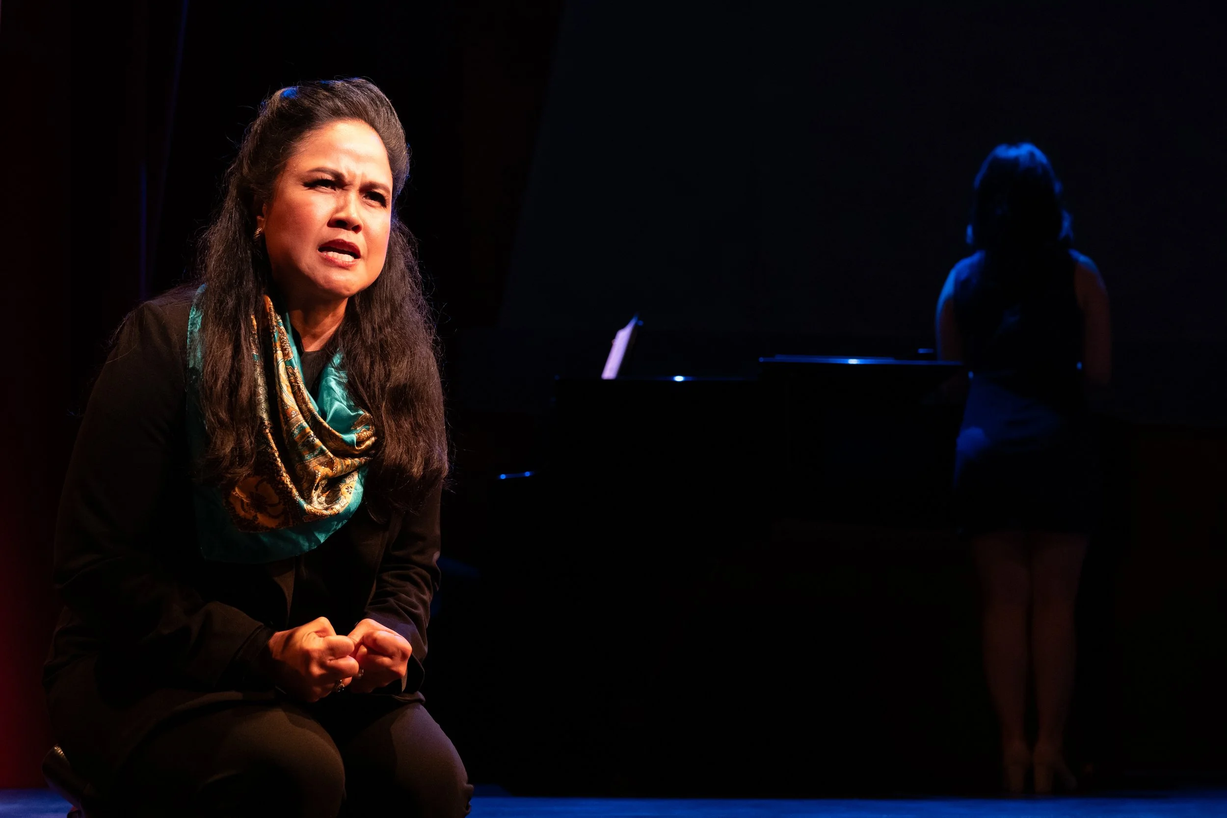 Additional theater credits include Donna in Mamma Mia and Jane Moore in Assassins with East West Players (praised by Variety as "majestic... best-in-show by far" in Krunk Fu Battle Battle, a "scorching jazz singer" in Road to Saigon, and singing "with impeccable purity... Her golden notes lend depth" in Songs for a New World at Rubicon Theatre); appearances in Mama Bares in Concert productions such as Once Upon a Play Date, Criers for Hire, Chess, Krunk Fu Battle Battle, and Road to Saigon; and leading roles in Songs for a New World (directed by Jon Lawrence Rivera) and It’s Only Life (directed by Daisy Prince) at Rubicon Theatre.